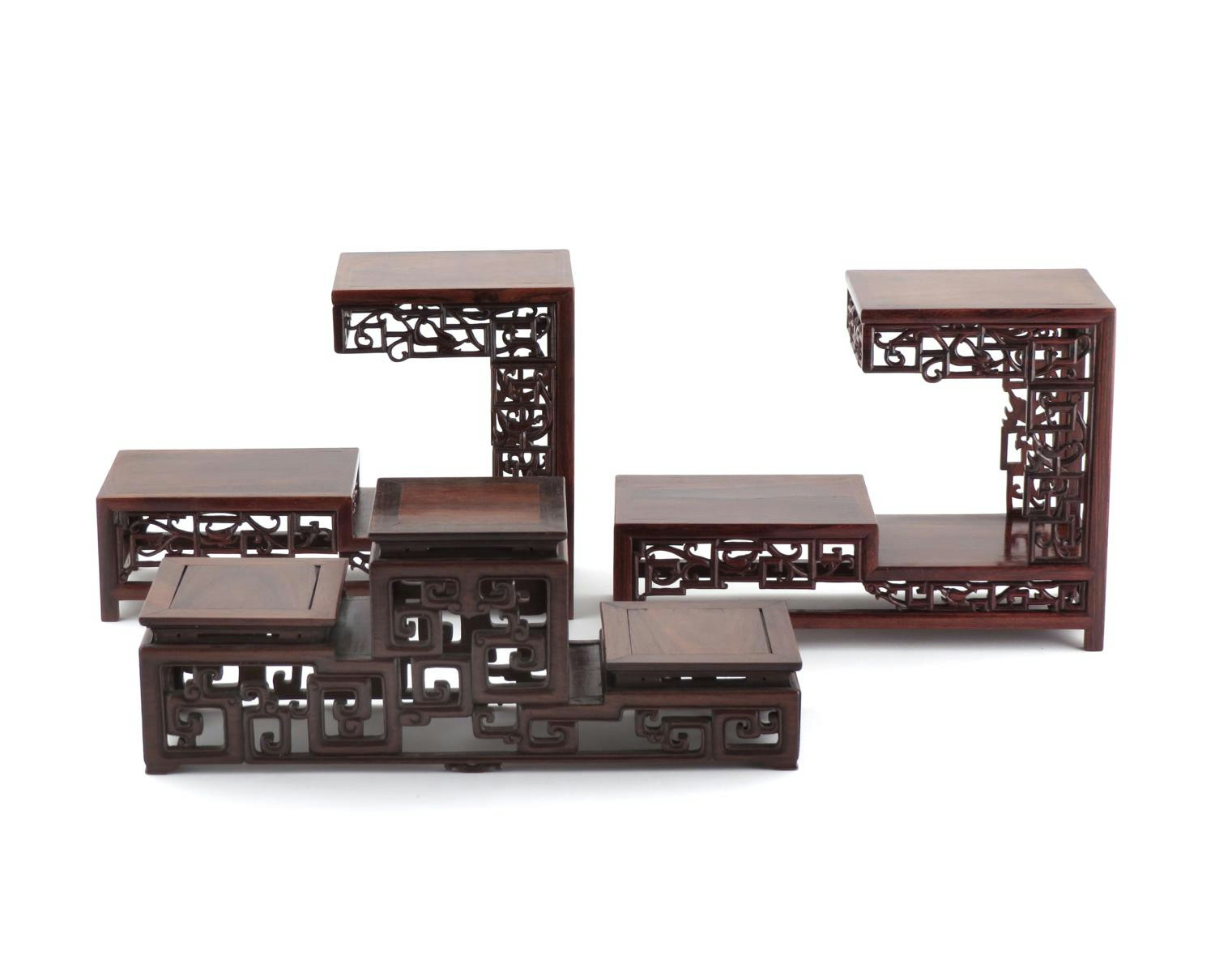 THREE CHINESE HARDWOOD STANDS 20TH CENTURY Each with three platforms