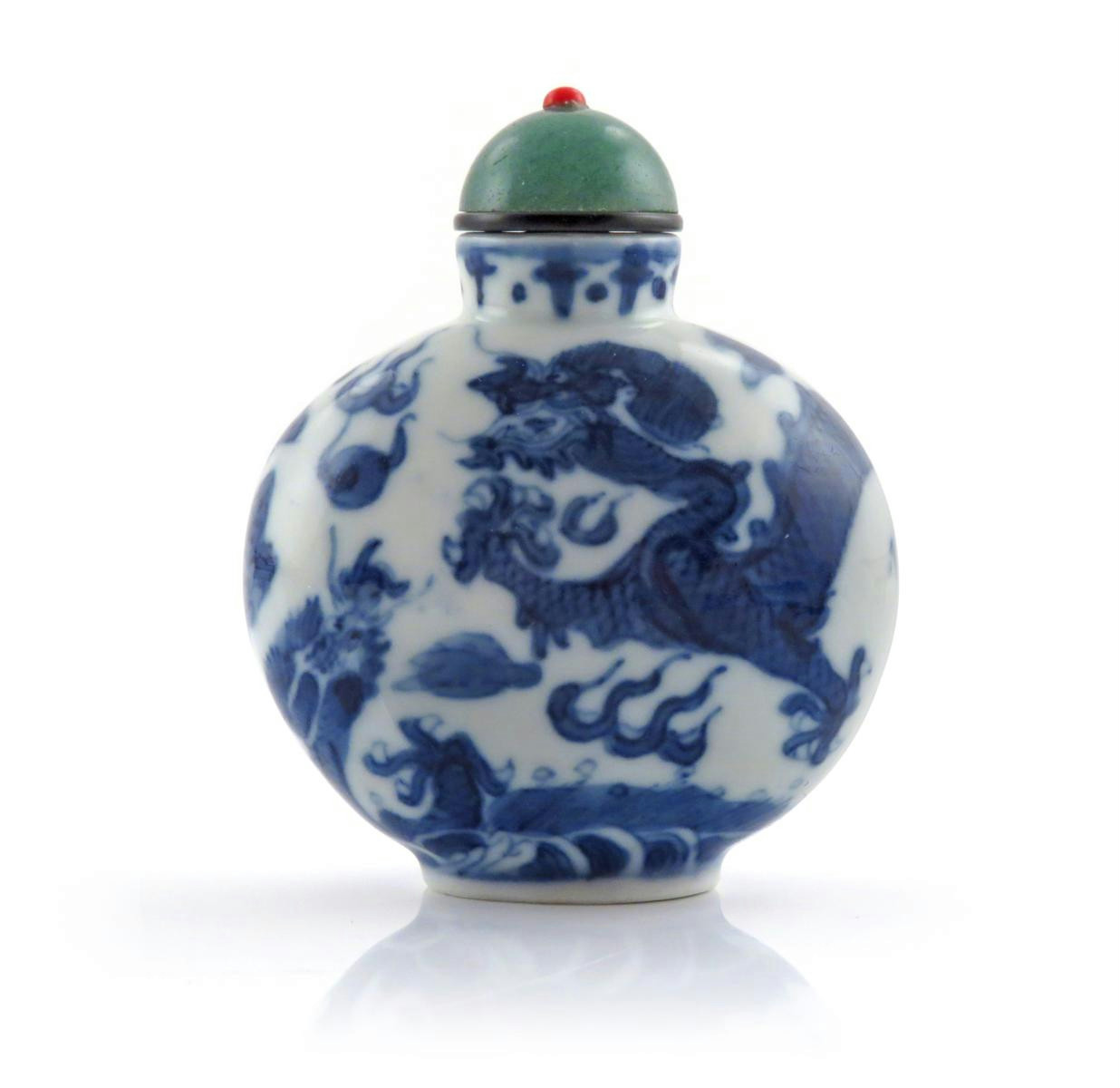 A CHINESE BLUE AND WHITE SNUFF BOTTLE 19TH OR 20TH CENTURY Painted with dragons contesting a...