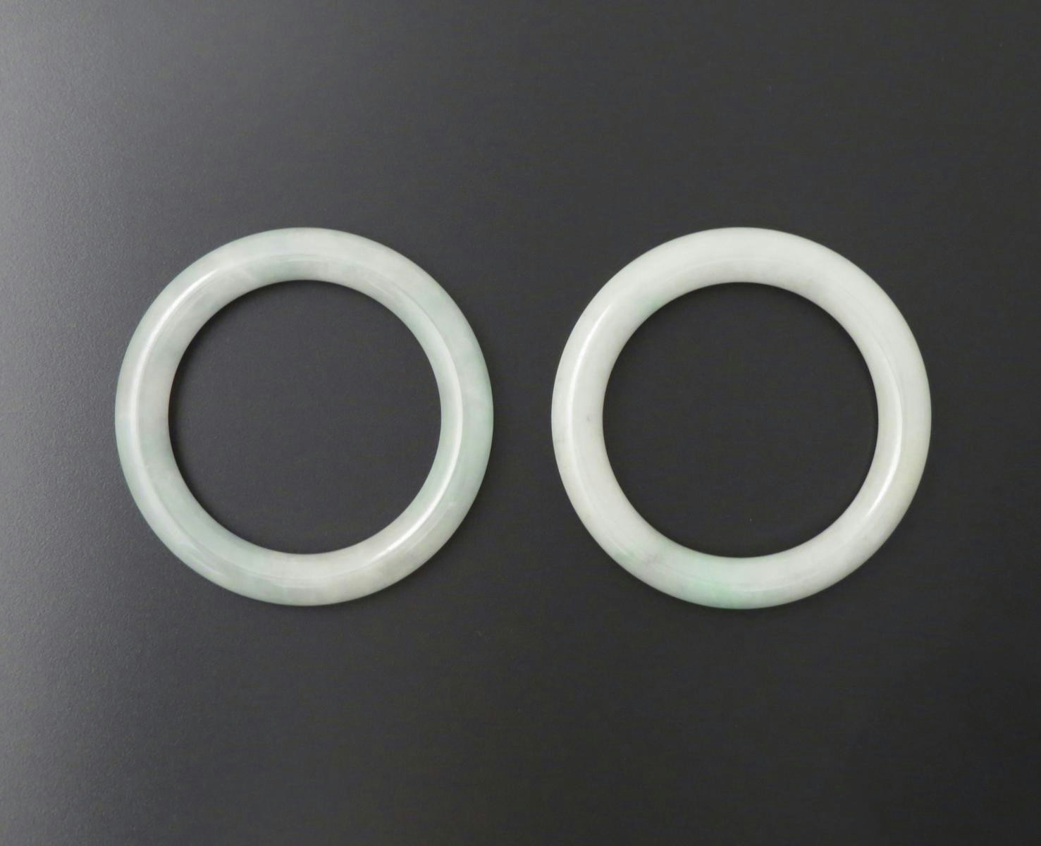 A PAIR OF CHINESE JADEITE BANGLES MODERN With pale green mottling to the stone