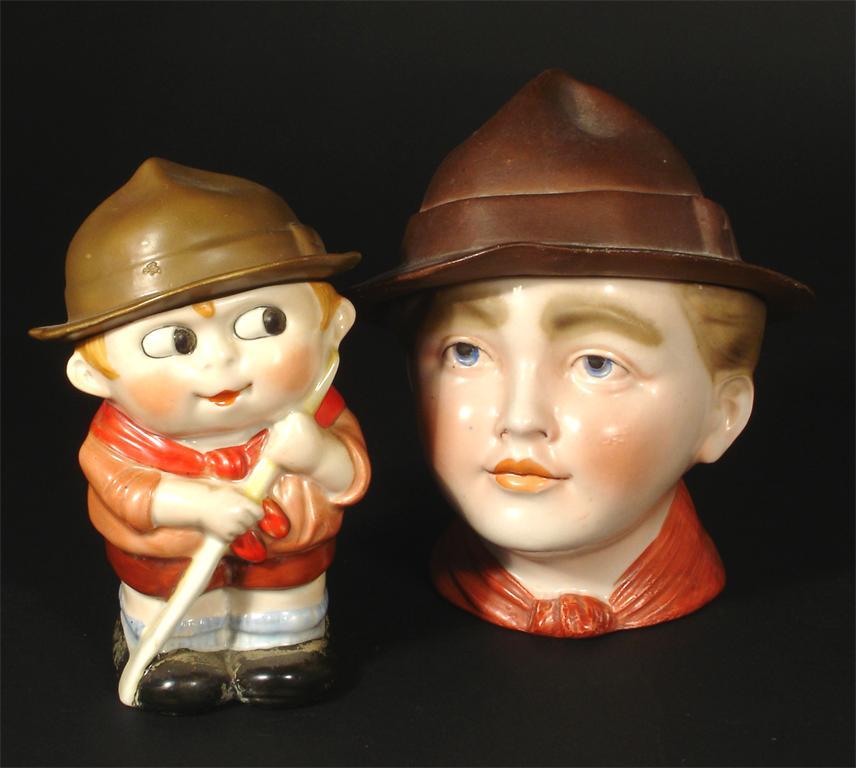 A Continental porcelain boy scout pot and cover in the style of Chloe Preston, modelled with kewpie eyes, painted in colours, a similar bust length model of a boy scout box and cover impressed number to main item, faint hairline 15cm. high