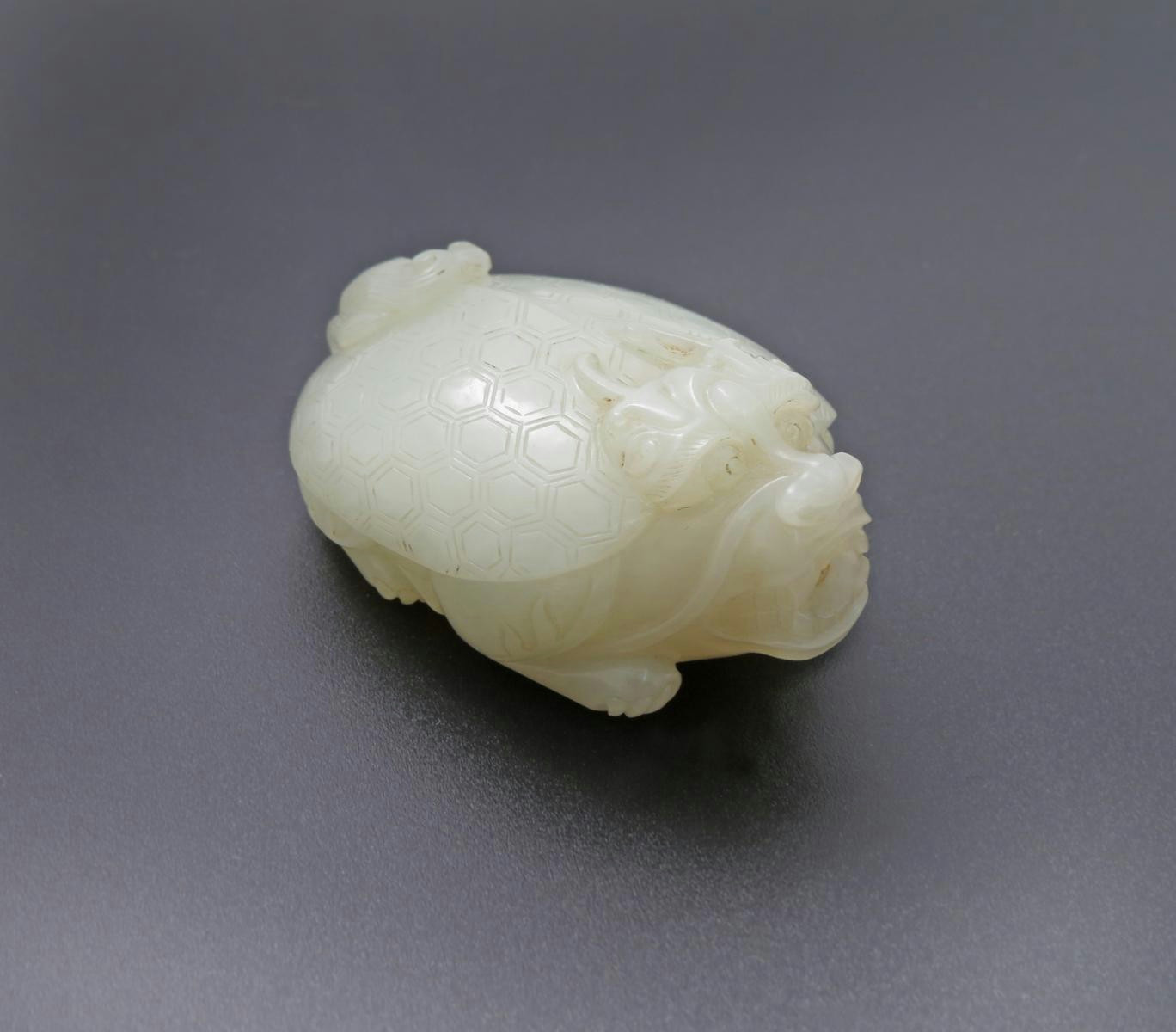 Carved as a crouching mythical beast, with a tortoise's shell and dragon-like horns, 6cm.