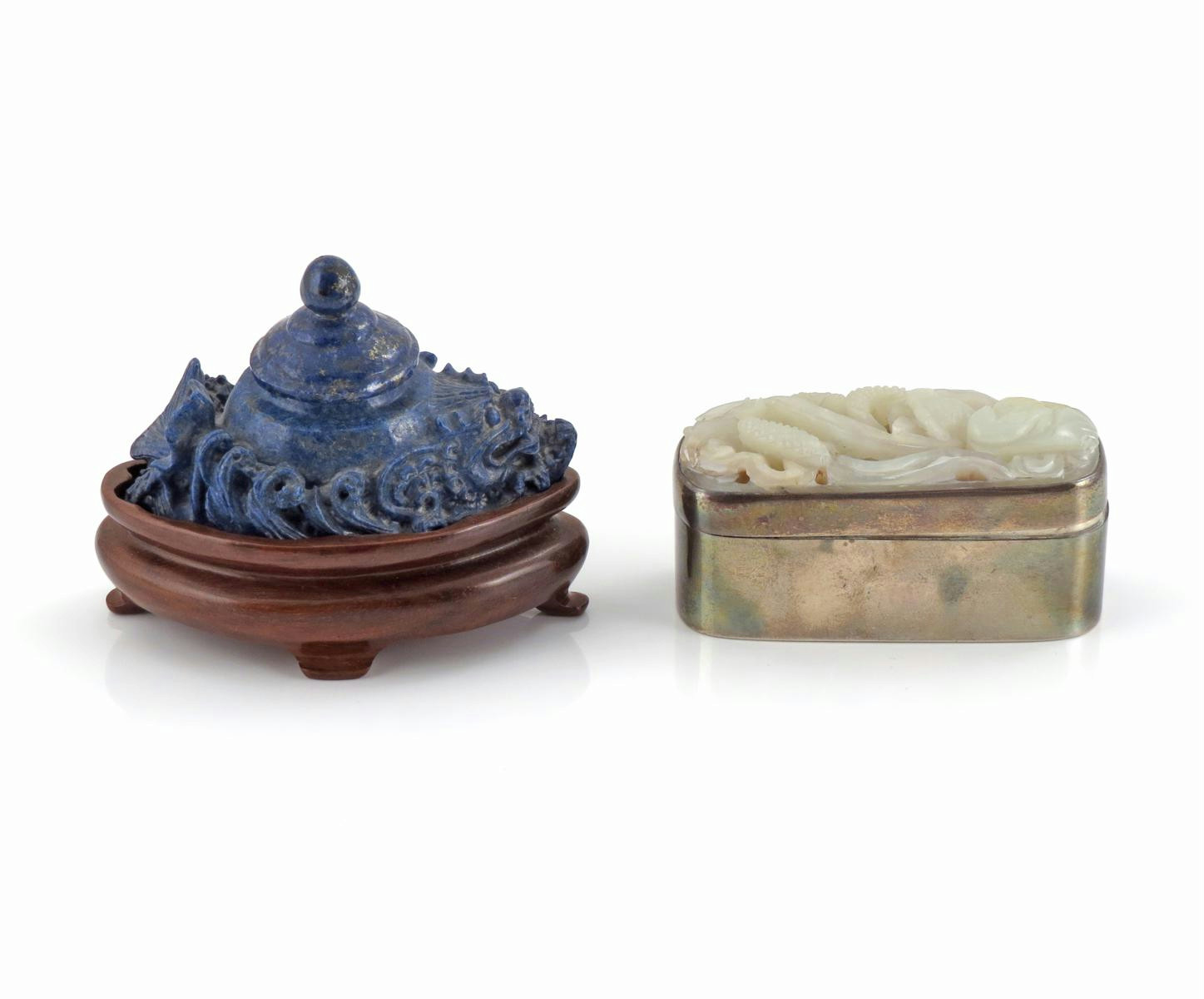 Carved with a fish amidst waves, raised on a wood stand, and a silver box, the cover mounted with a jade plaque, 8.5cm. (5)