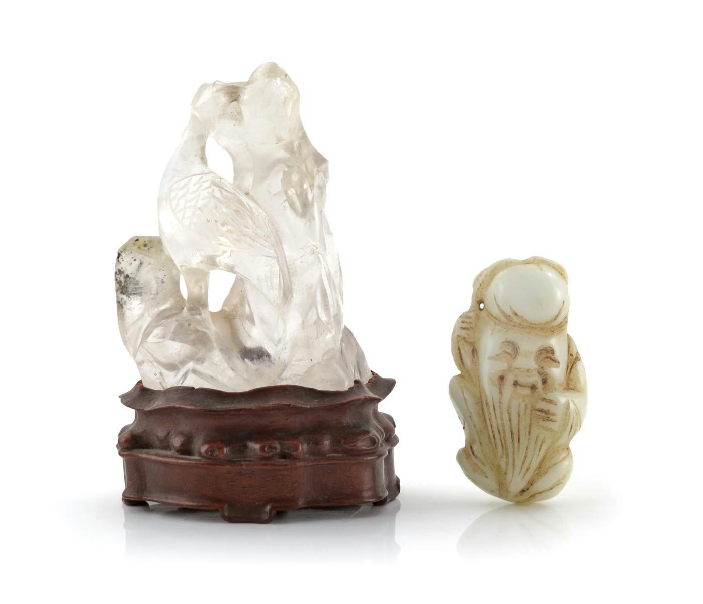 Perched on rockwork, its right leg raised on a rocky outcrop, together with a white jade carving of a bearded figure holding a lingzhi fungus, the former with a fitted hardwood stand, 9.7cm. (3)