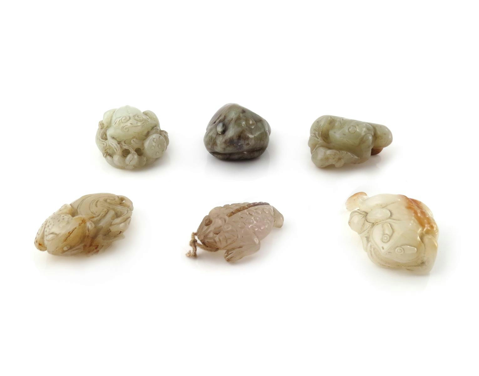 Variously carved in crouching positions, two with lotus, one with a fruiting branch, the fourth with a bat and lingzhi fungus, and two carvings of three-legged toads, the stones in celadon, russet and brown tones, 5.5cm. (6)