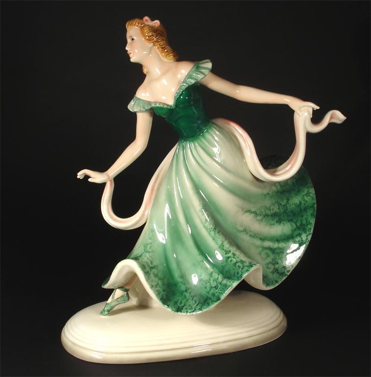 A Keramos Pottery figure modelled as a woman in green dress holding a flowing scarf printed mark