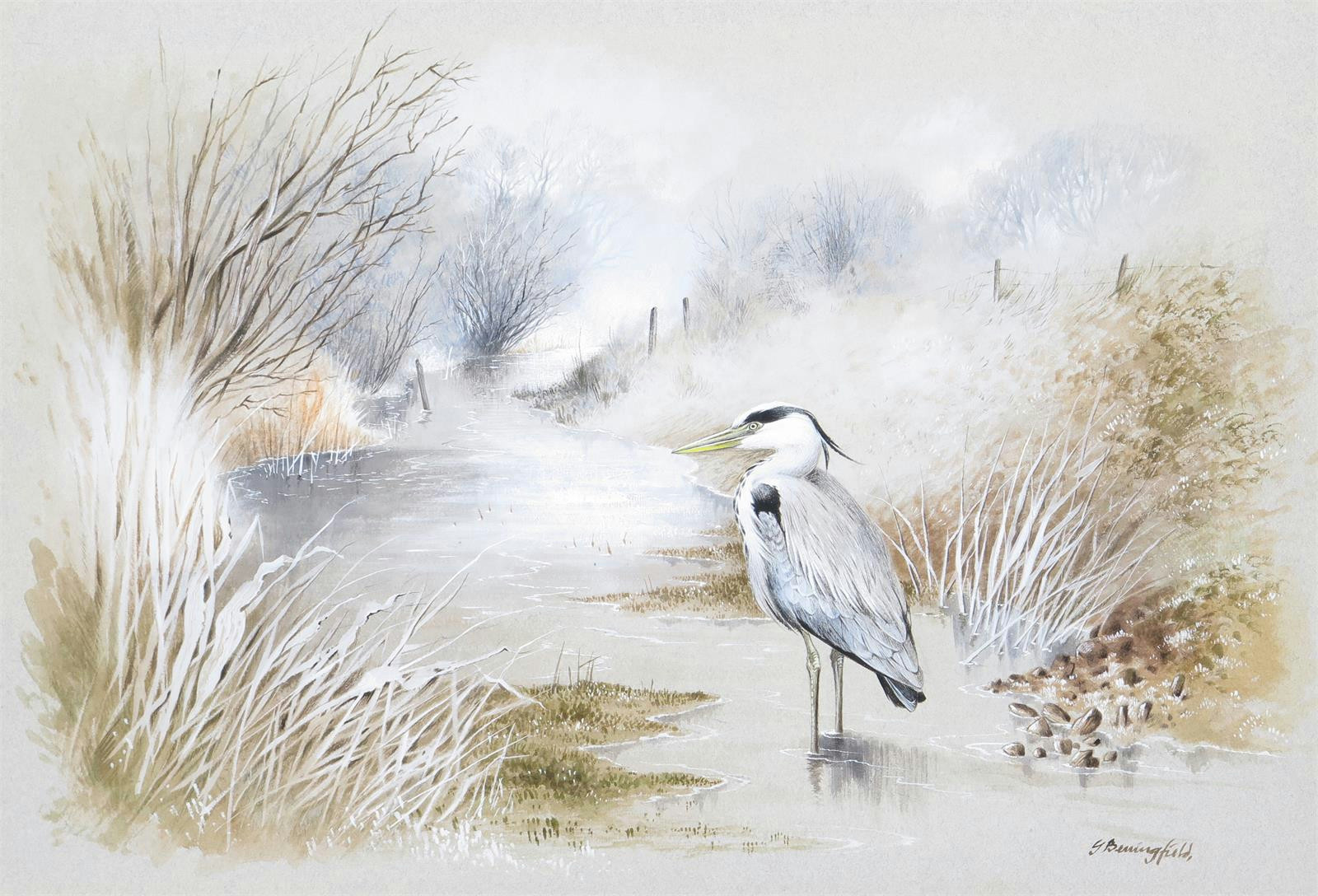 ‡Gordon Beningfield (1936-1998) A heron in a winter river landscape Signed Watercolour on pale...