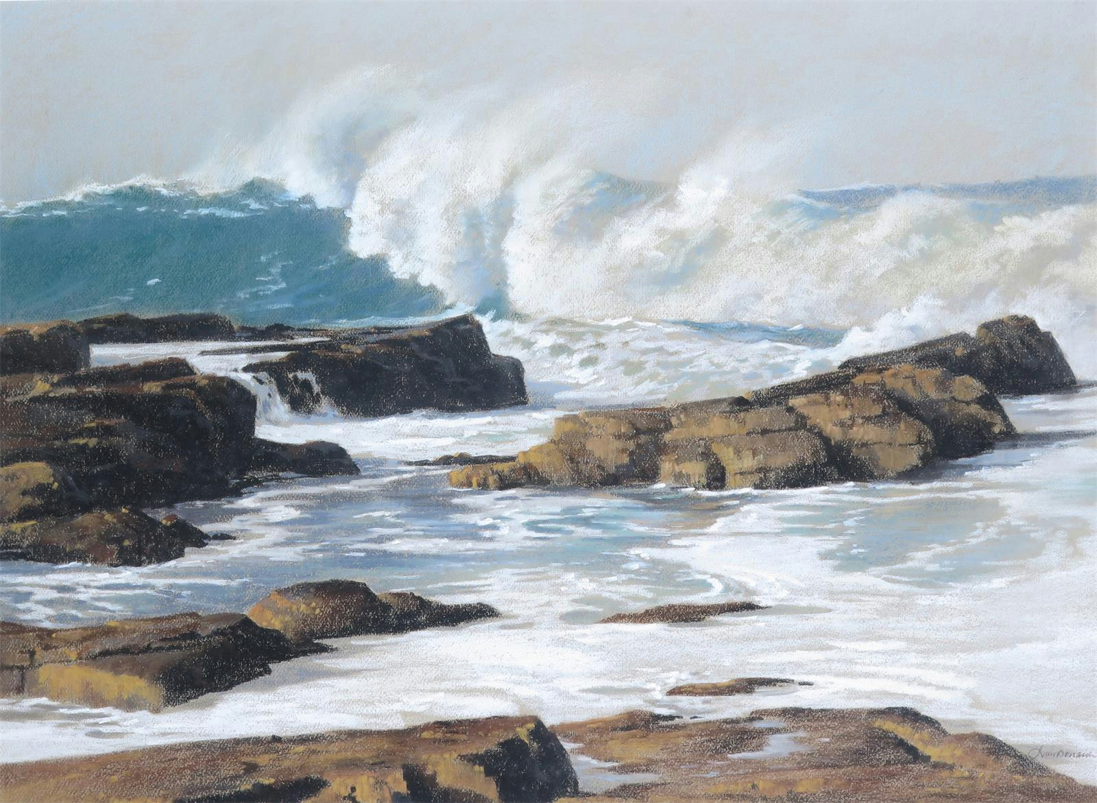 Kim Donaldson (South African b.1952) Waves on a rocky shore Signed Pastel on buff paper 52 x 71cm