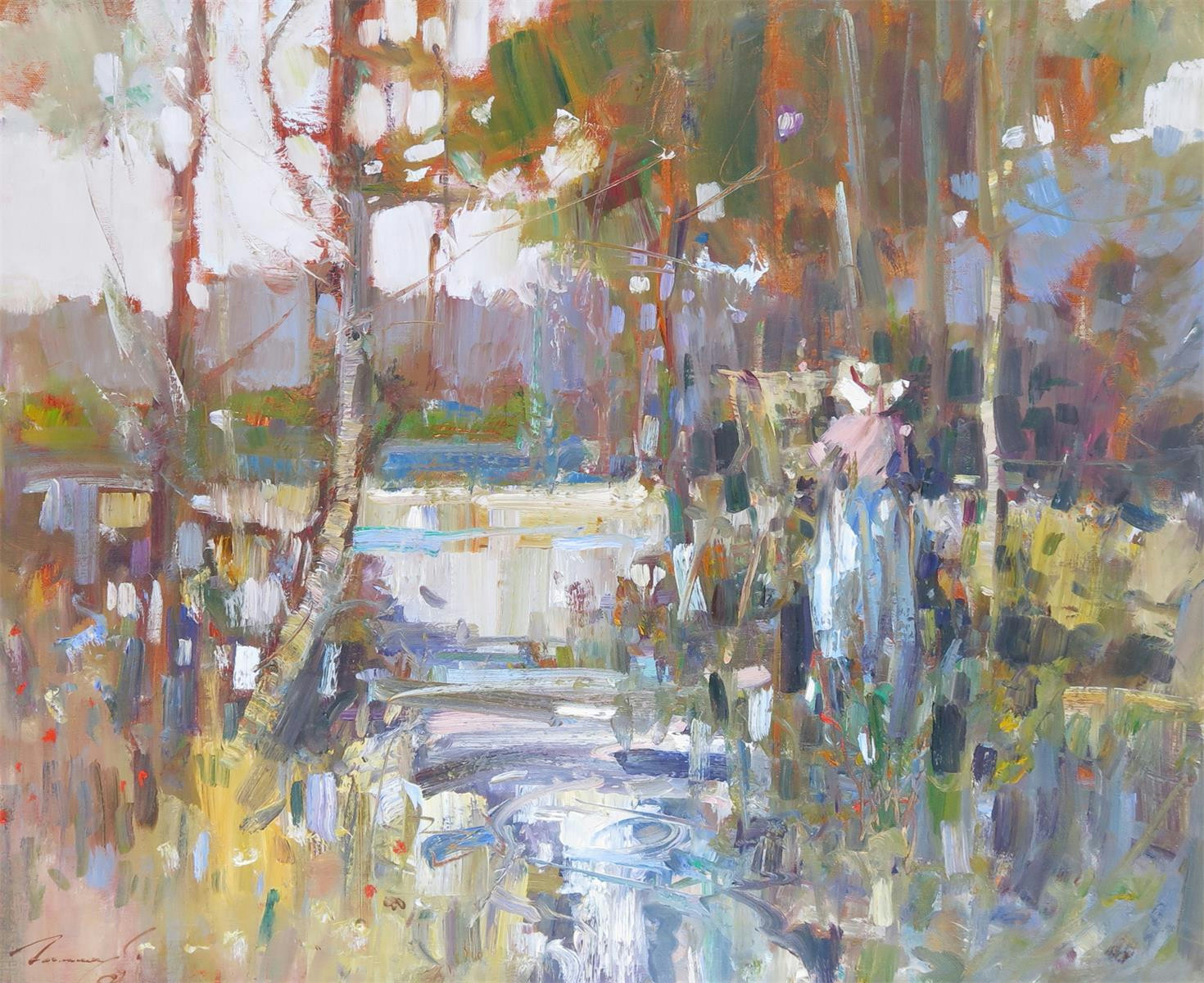 English School 20th Century A lady painting in a wooded glade Signed and dated indistinctly Oil...