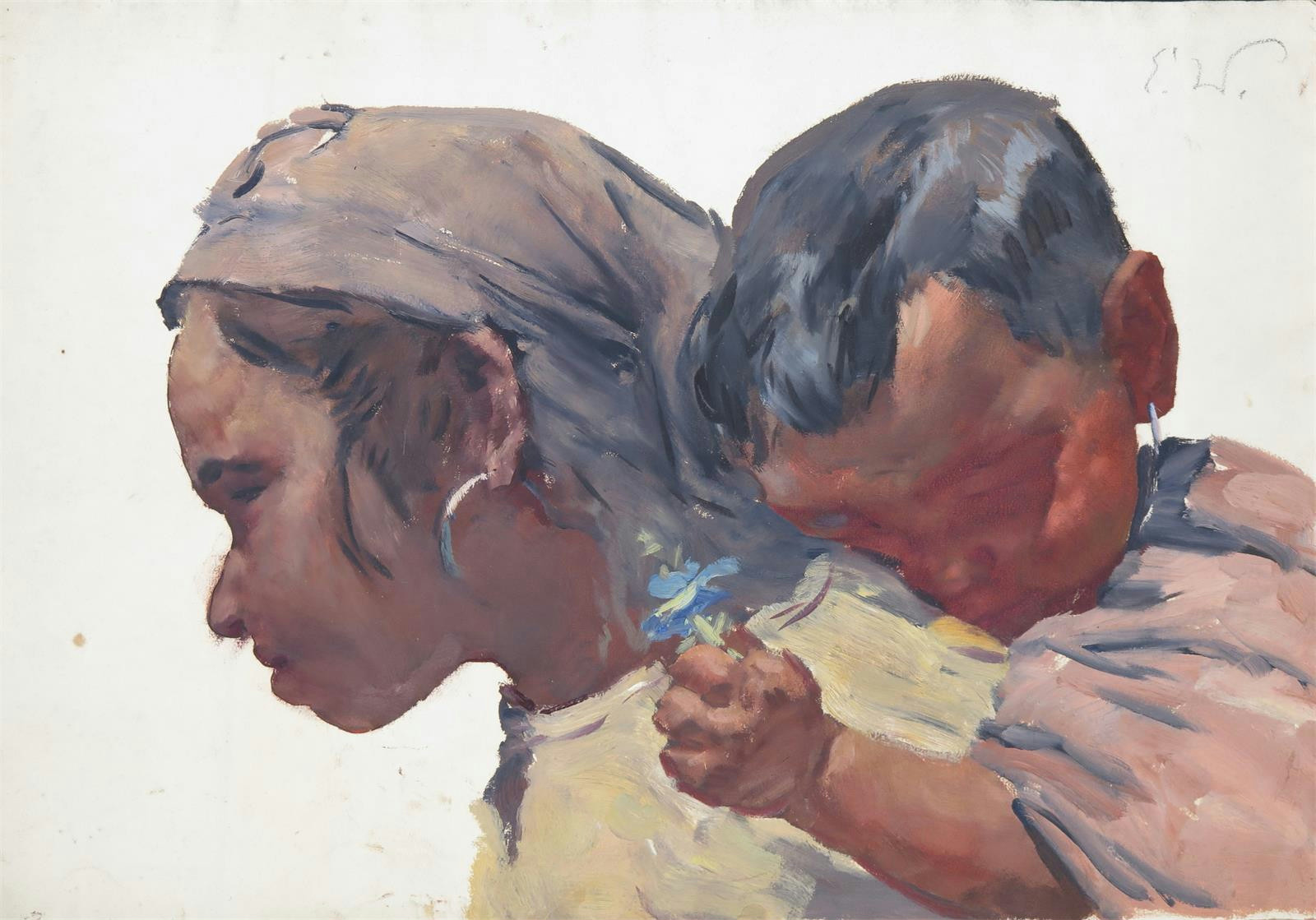 ‡Erich Wolfsfeld (1885-1956) A mother carrying her son on her back Signed with initials Oil on paper