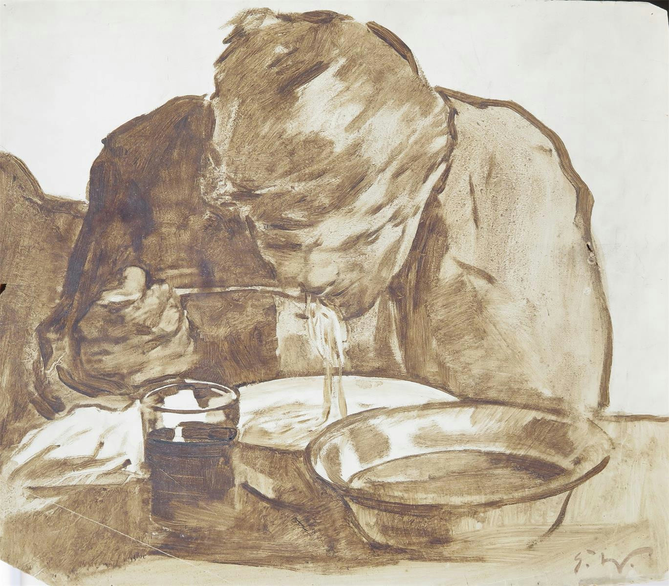‡Erich Wolfsfeld (1885-1956) A man eating spaghetti Signed with initials Oil on paper