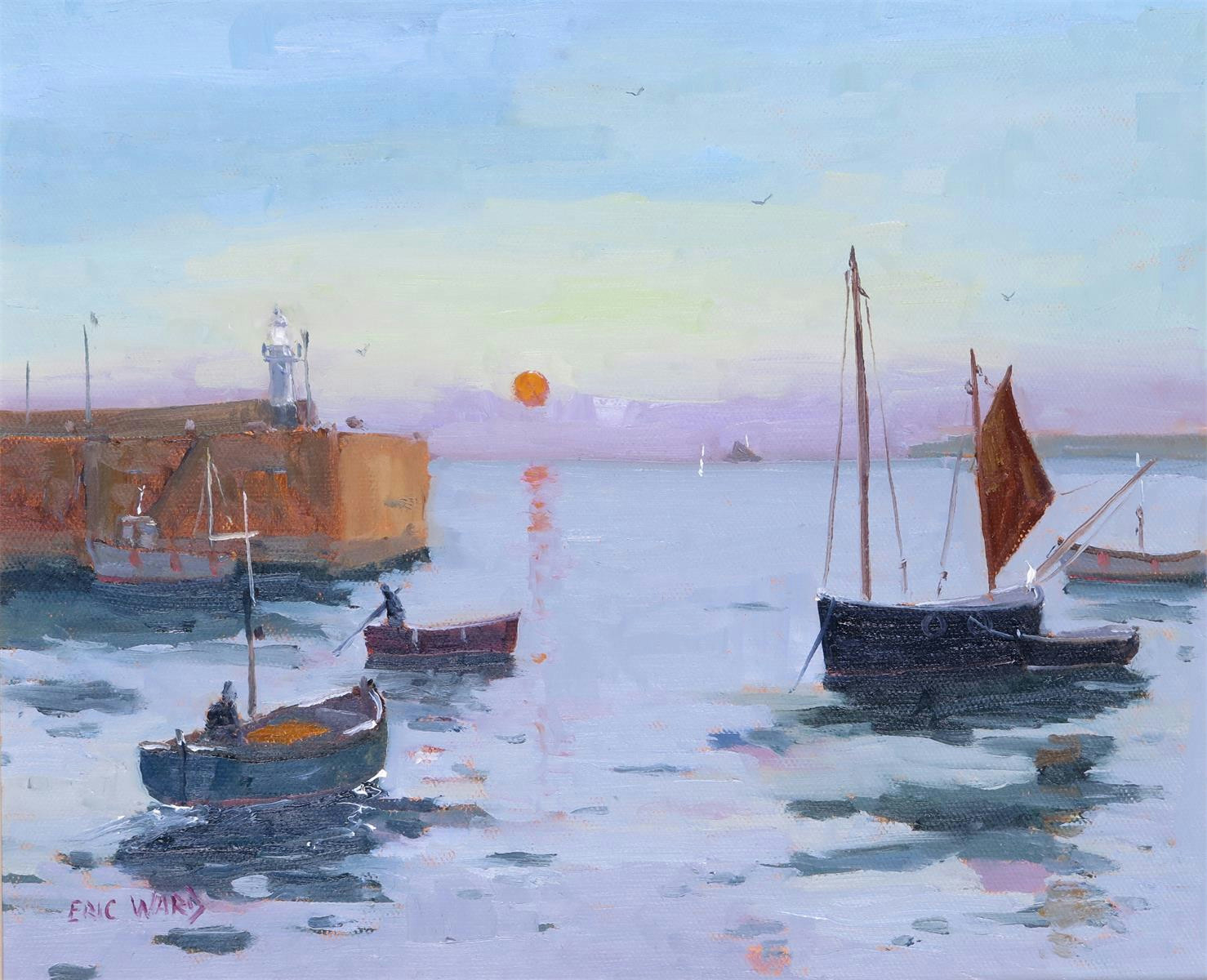 ‡Eric Ward (b.1945) Ships leaving a Cornish harbour at sunrise Signed Oil on canvas 25 x 30cm