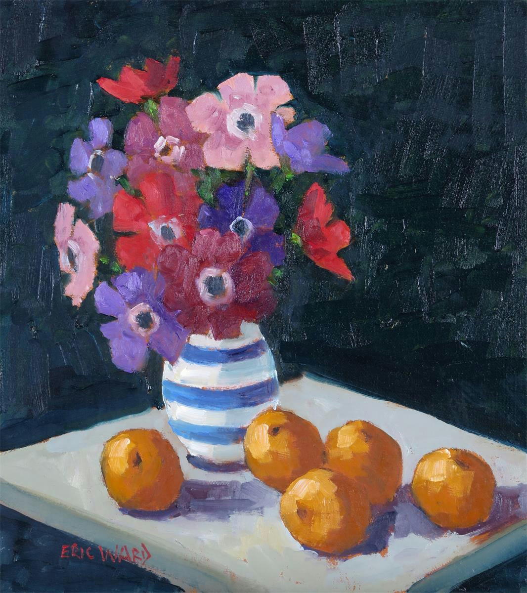 ‡Eric Ward (b.1945) Flowers and oranges Signed Oil on board 25 x 23cm