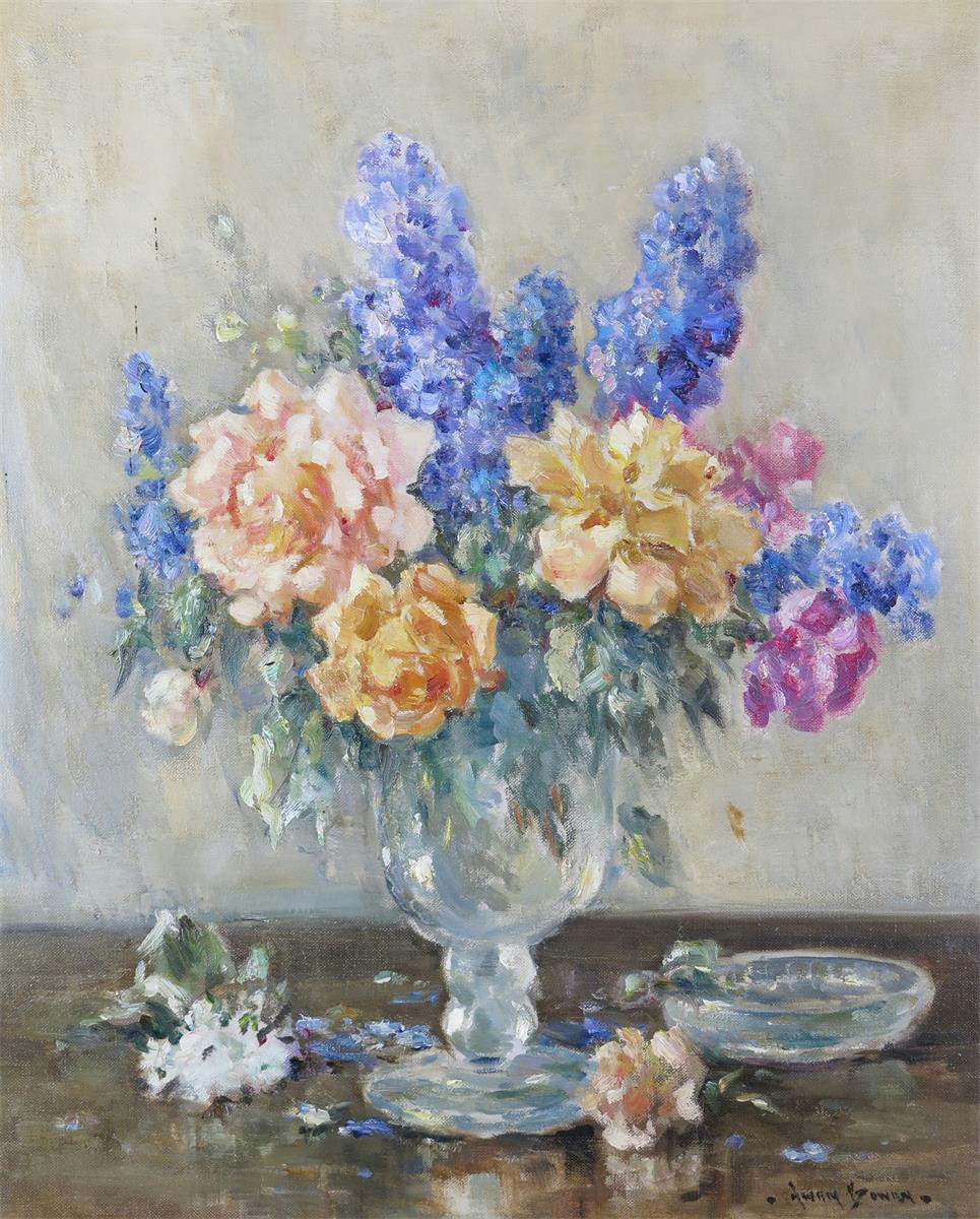 ‡Owen Bowen (1873-1967) Still life of delphiniums and roses in a glass Signed Oil on canvas 61 x...