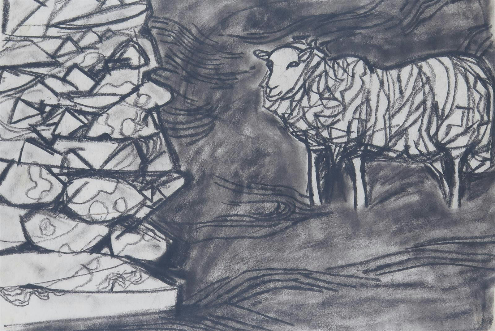 ‡Brian Bradshaw (b.1923) A sheep by a dry-stone wall Grisaille pastel 37 x 54cm