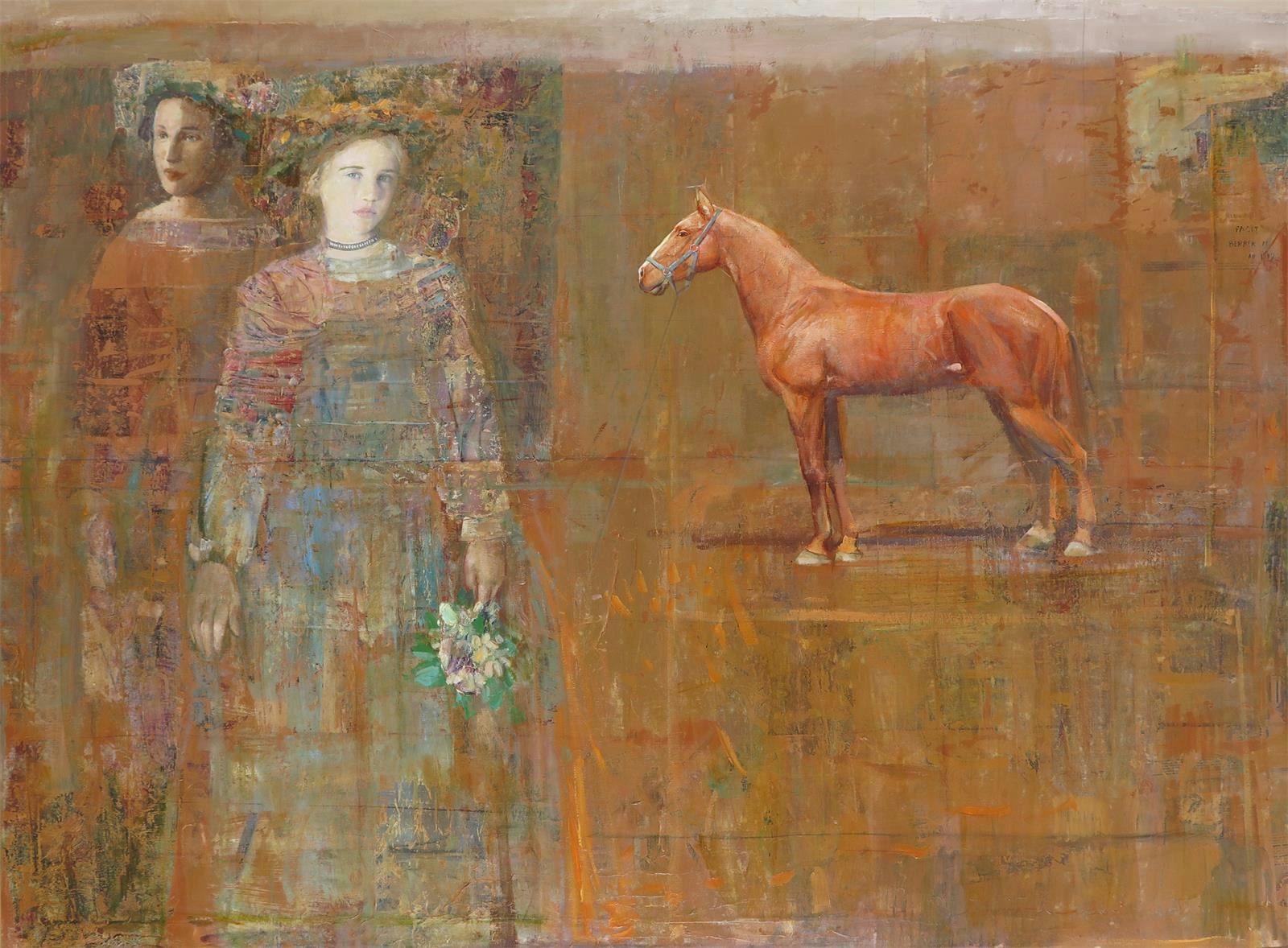 ‡Mersad Berber (Bosnian 1940-2012) Two figures with a horse Signed and dated 1999 Oil and collage...