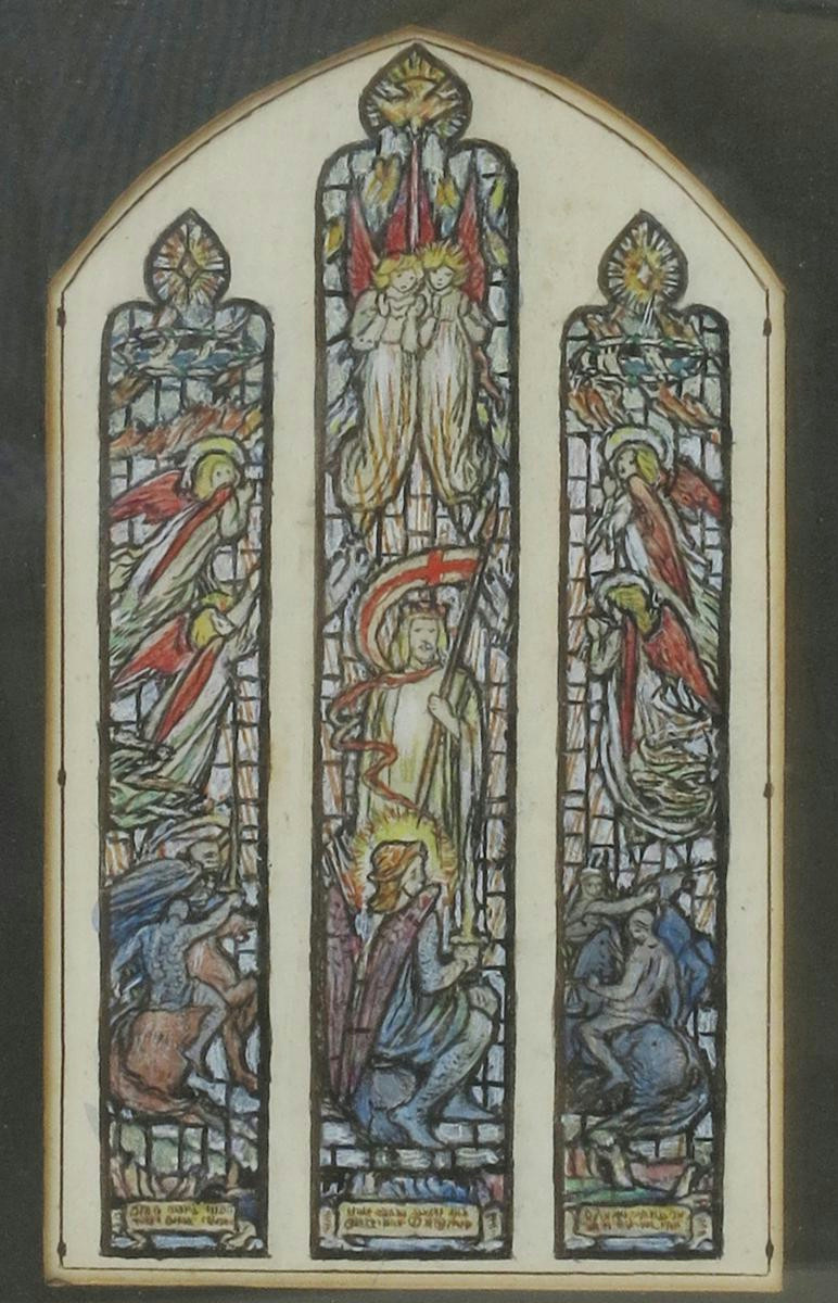 Adoration of the Magi a stained glass triptych window design by Reginald Hallward, watercolour and pencil on paper, framed, and five other stained glass window designs by Reginald Hallward, framed annotated to reverse, 30.5 x 24.5cm. (6)