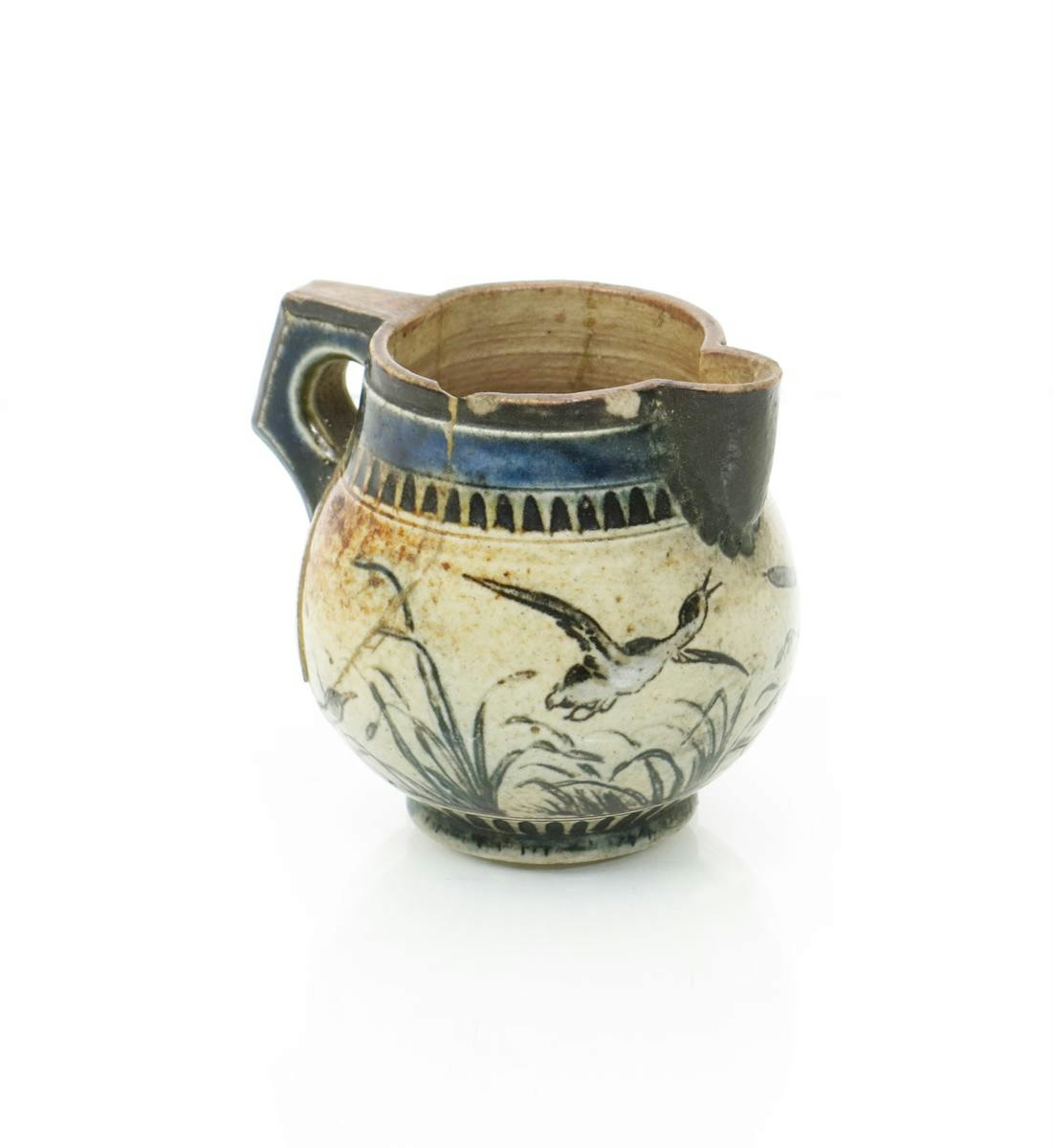 A Martin Brothers stoneware jug, dated 1884, incised with ducks flying past bullrushes, in green and white on a buff ground, incised 2-84 RWMartin & Bros London & Southall, smashed and repaired 6.5cm. high