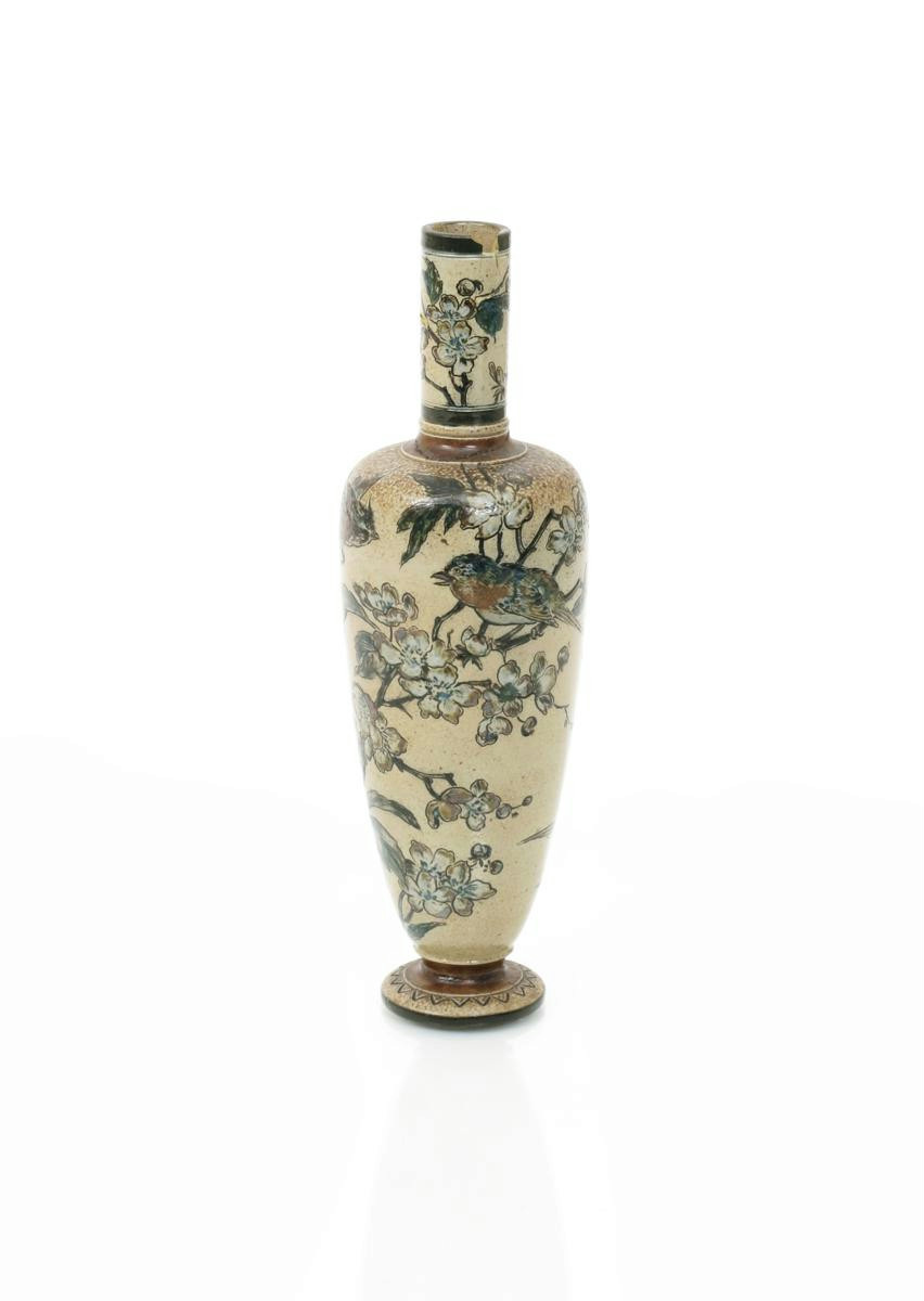 A Martin Brothers stoneware vase by Robert Wallace Martin, dated 1891, slender, shouldered form, incised with finches flying and perched amongst apple blossom, in green, brown and white on a buff ground incised 1-1891 R W Martin & Bros, London & Southall, repaired neck, small loss to top rim, 23.5cm. high