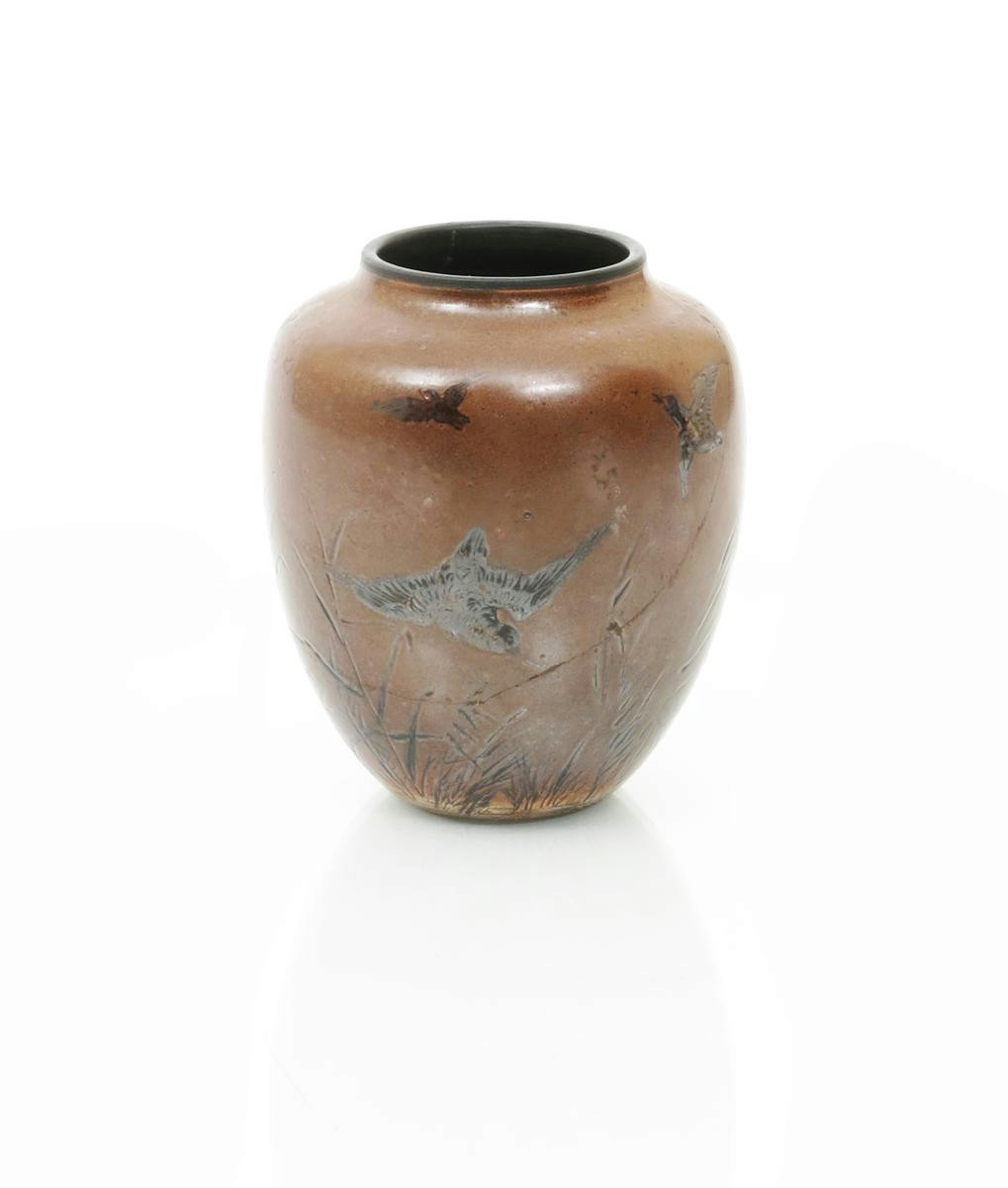 A Martin Brothers stoneware vase, shouldered form, incised and painted with ducks and waterfowl, in shades of brown and white on a buff ground incised 1-1900 Martin Bros, London & Southall, repaired section out 13cm. high
