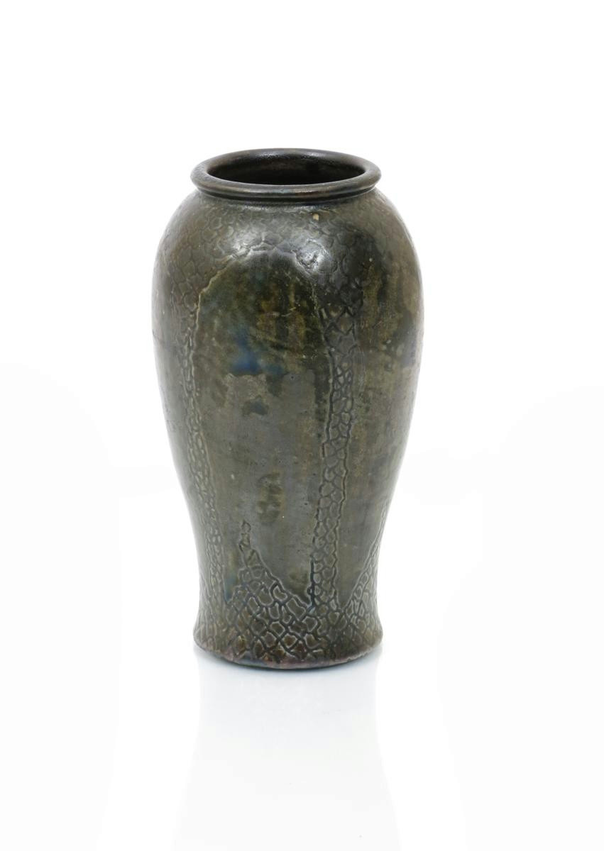 A Martin Brothers stoneware vase by Robert Wallace Martin, incised with foliate design, glazed in shades of green, incised R W Martin & Bros Southall, small chips to base rim 19.5cm. high