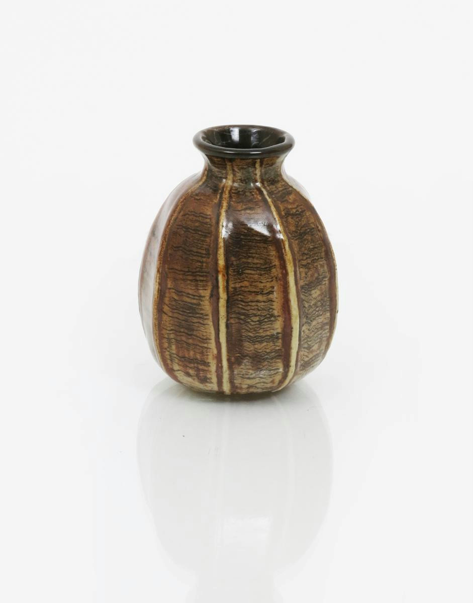 A Martin Brothers stoneware gourd vase by Edwin & Walter Martin, dated 1899, veined ovoid form, painted in shades of brown with fine horizontal veins incised 1-99 Martin Bros London, restored neck, paper collection number, 7.5cm. high