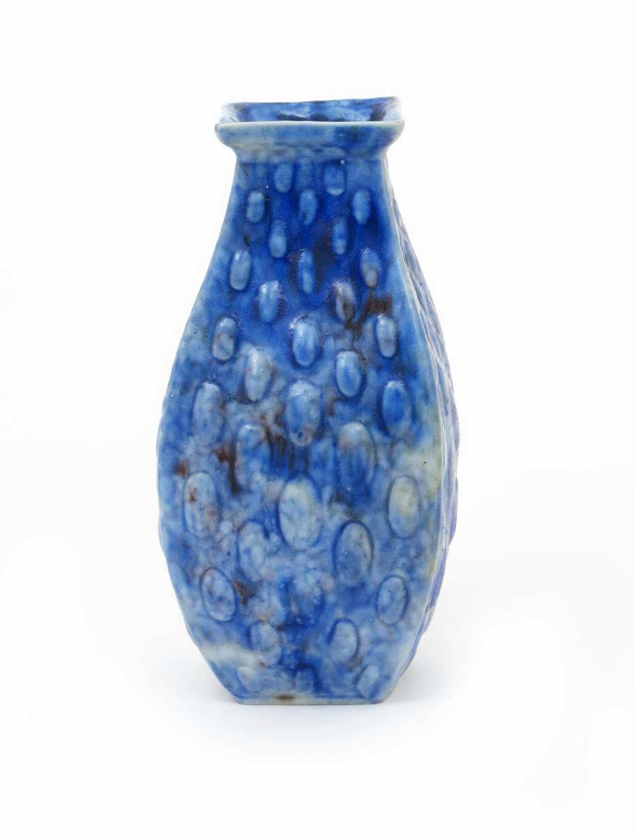 A Martin Brothers stoneware gourd vase, swollen square section, cast in low relief with spots, covered in a blue glaze incised R W Martin & Bros Southall, repaired chip to top rim, 24.5cm. high
