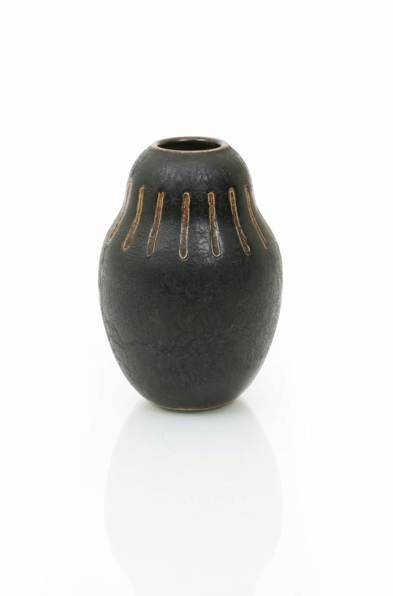 A Martin Brothers stoneware gourd vase by Edwin and Walter Martin, dated 1905, shouldered form incised with vertical grooves on a textured bronze ground, incised 11-1905 Martin Bros London & Southall 19cm. high