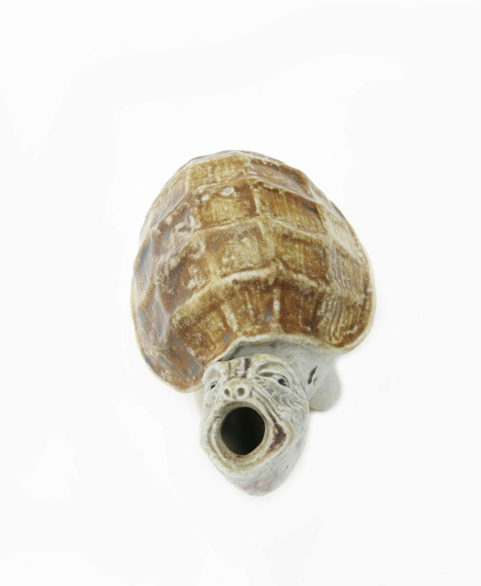 A rare Martin Brothers stoneware inkwell modelled as tortoise by Robert Wallace Martin, modelled with head out and mouth gaping to form the well, glazed grey and brown with traces of aubergine, incised R W Martin & Bros, Southall B-37 13cm. wide