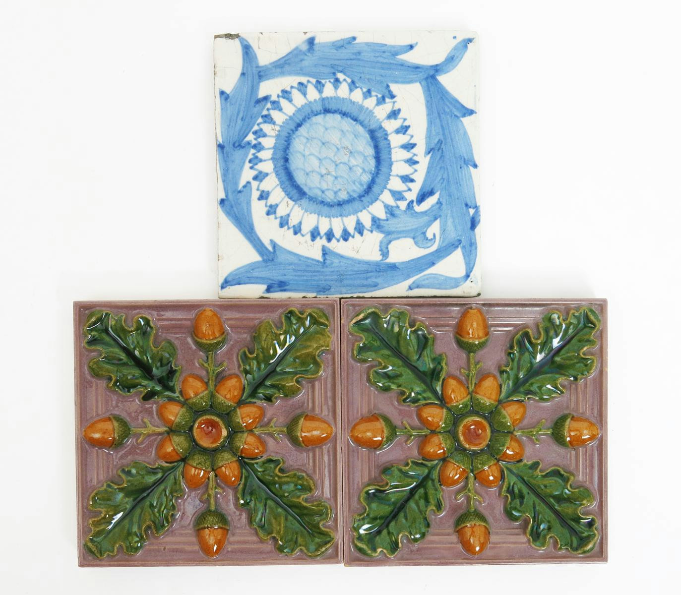 A Dutch Sunflower tin glaze tile designed by William Morris or William De Morgan, painted in shades of blue on an off white ground, and two Maw & Co tiles moulded in relief with radiating oak leaf and acorn design, and a slate panel, impressed marks to Maw tiles, glaze chips, 15.5cm. square (4)
