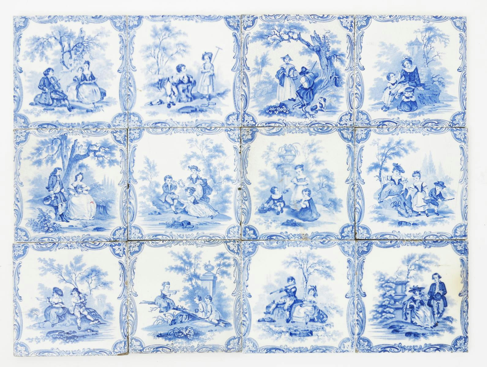 A set of twelve Minton's Watteau series tiles, each tile printed in blue on a white ground impressed marks, minor rim chips, 15.5cm. square (12)