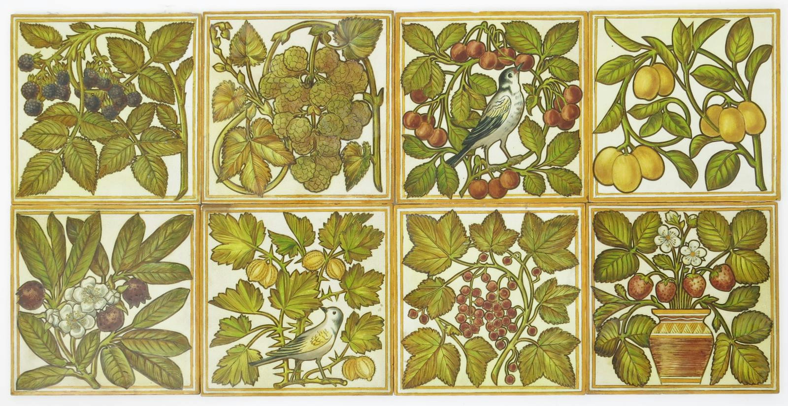 A set of eight large W.B Simpson tiles, painted with birds amongst berried foliage, in colours on a white ground, impressed marks, minor rim chips, 23.5cm. square (8)