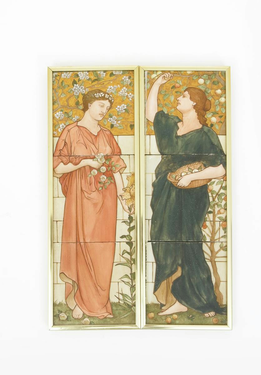 A pair of Minton's Hollins & Co three tile panels the design attributed to E.W. Godwin, each painted with a pre-raphaelite maiden, one in a walled flower garden picking a lily, the other in a walled orchard picking fruit, in colours, framed, impressed factory marks, 46.5 x 16cm. (2)