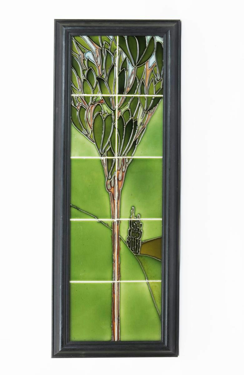 A Secessionist tile panel probably by Minton's, ten tiles, tubeline decorated with a tall tree in a landscape, in colours, with modern ebonised wood frame, and another similar, largest 76.5 x 23.5cm. (2)