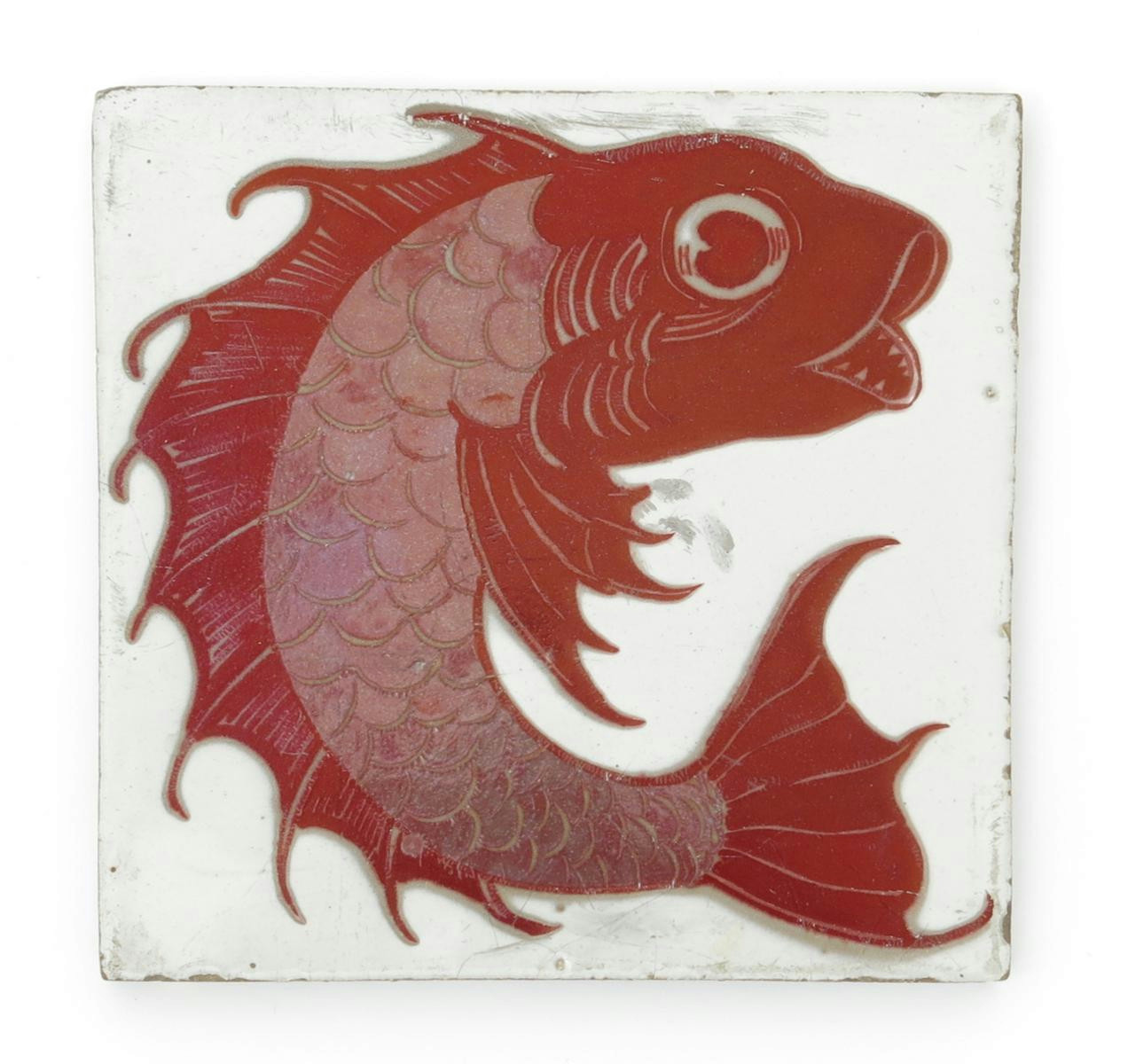 A William De Morgan tile, painted with a leaping scaly fish, in ruby lustre on a white ground 15.5cm. square