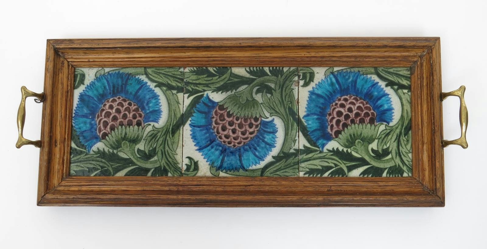 Three William De Morgan BBB tiles, mounted in a wooden tray, painted in shades of green, blue and aubergine on a white ground, the oak tray with brass handles, minor chips, to edges of tiles, 54cm. wide.