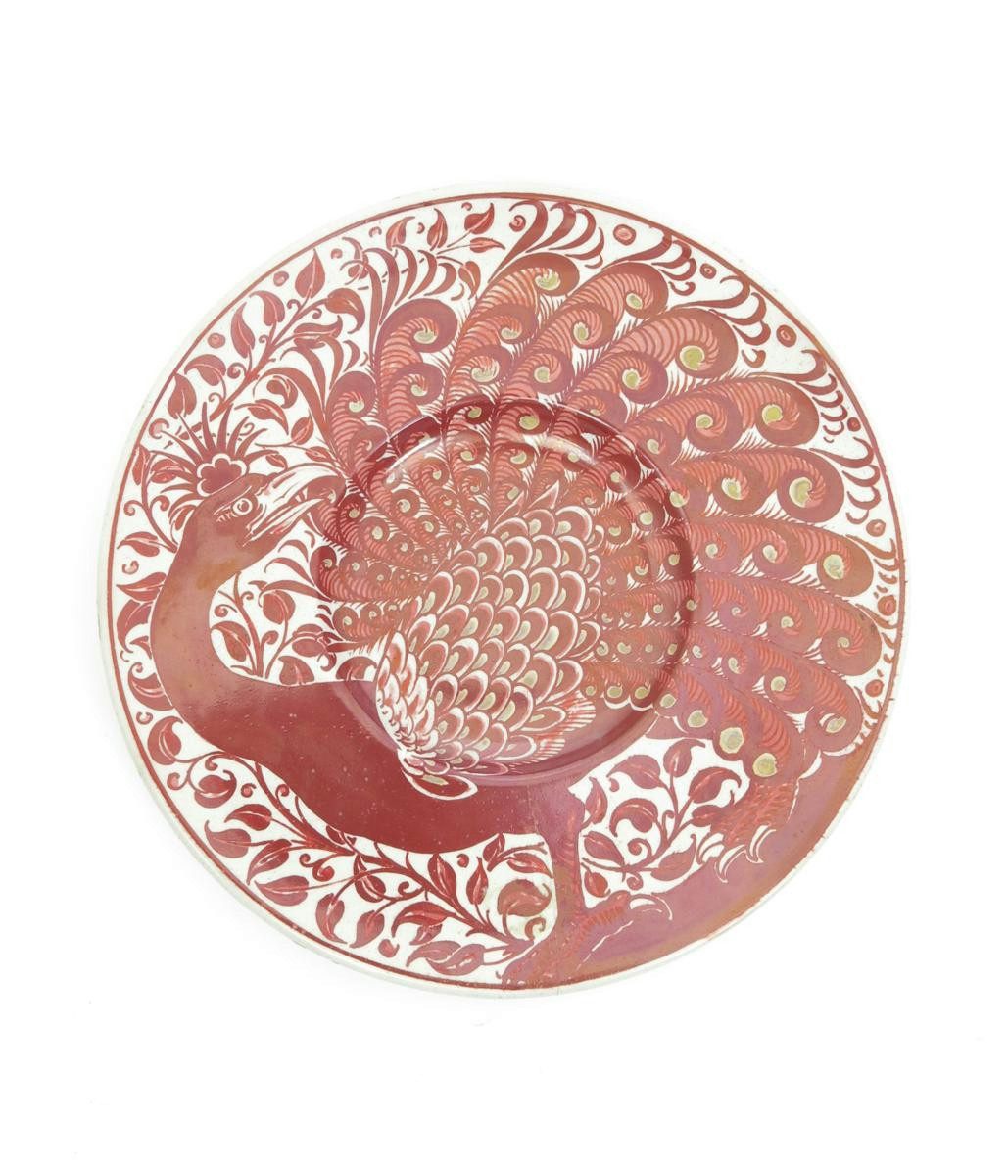 A William De Morgan plate, painted with a peacock in ruby and sand lustre on a cream ground, the reverse with radiating scrolling feather motif, unsigned, crack to rim, 31cm. diam.