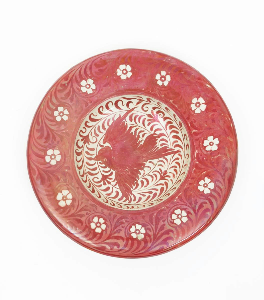 A Maw & Co pottery ruby lustre charger, painted to the well with a bird flying before scrolling foliage, the rim with a band of scrolling foliage and flowers, glazed ruby lustre on white painted Maw & Co with camel mark, modelled mask wall mounts to reverse,restored 47cm. diam.