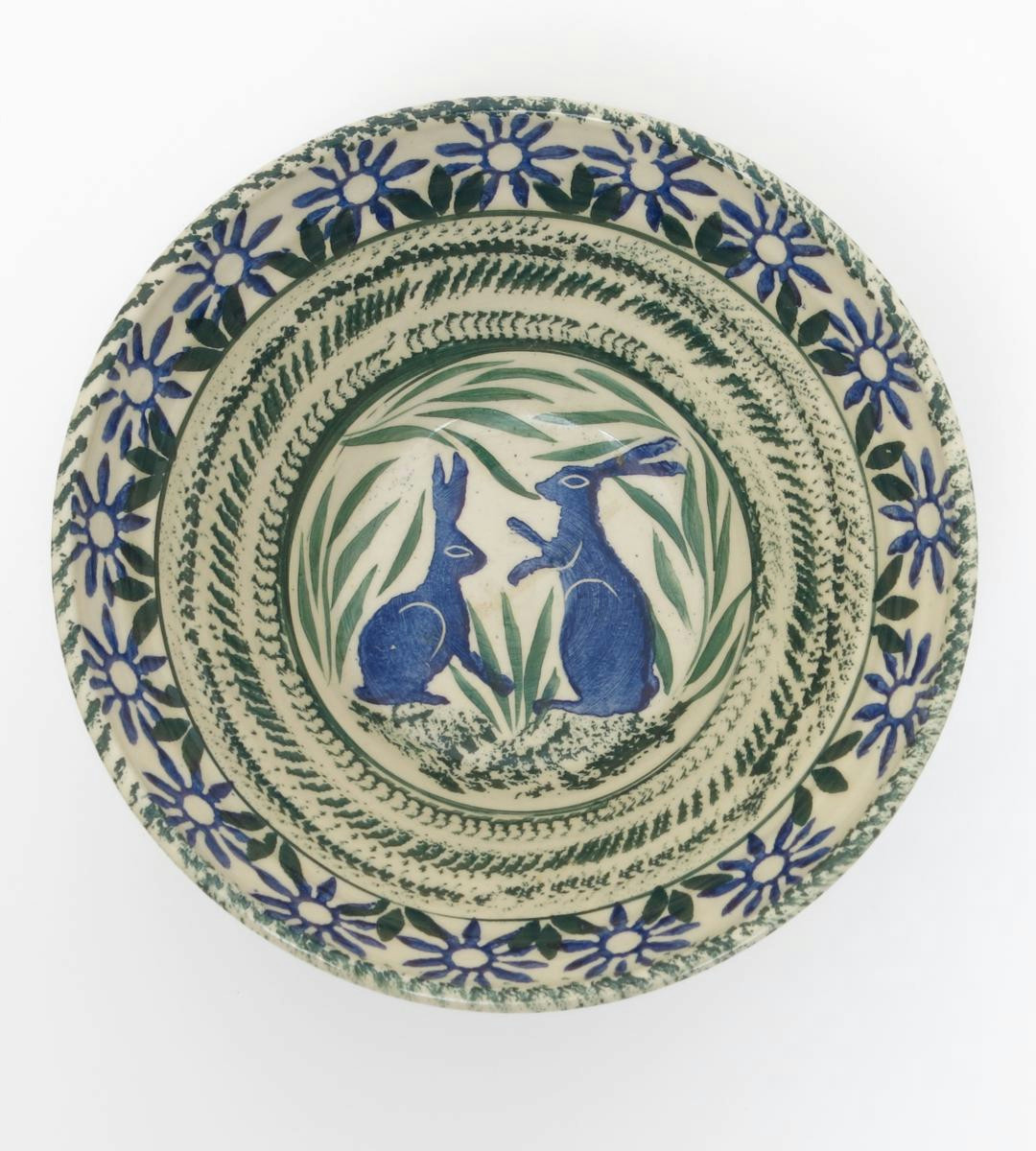 A J & M Bell pottery bowl, flaring conical form, printed with rabbits in the manner of William De Morgan, in blue and green on a cream ground, impressed bell mark, 21cm. diam.