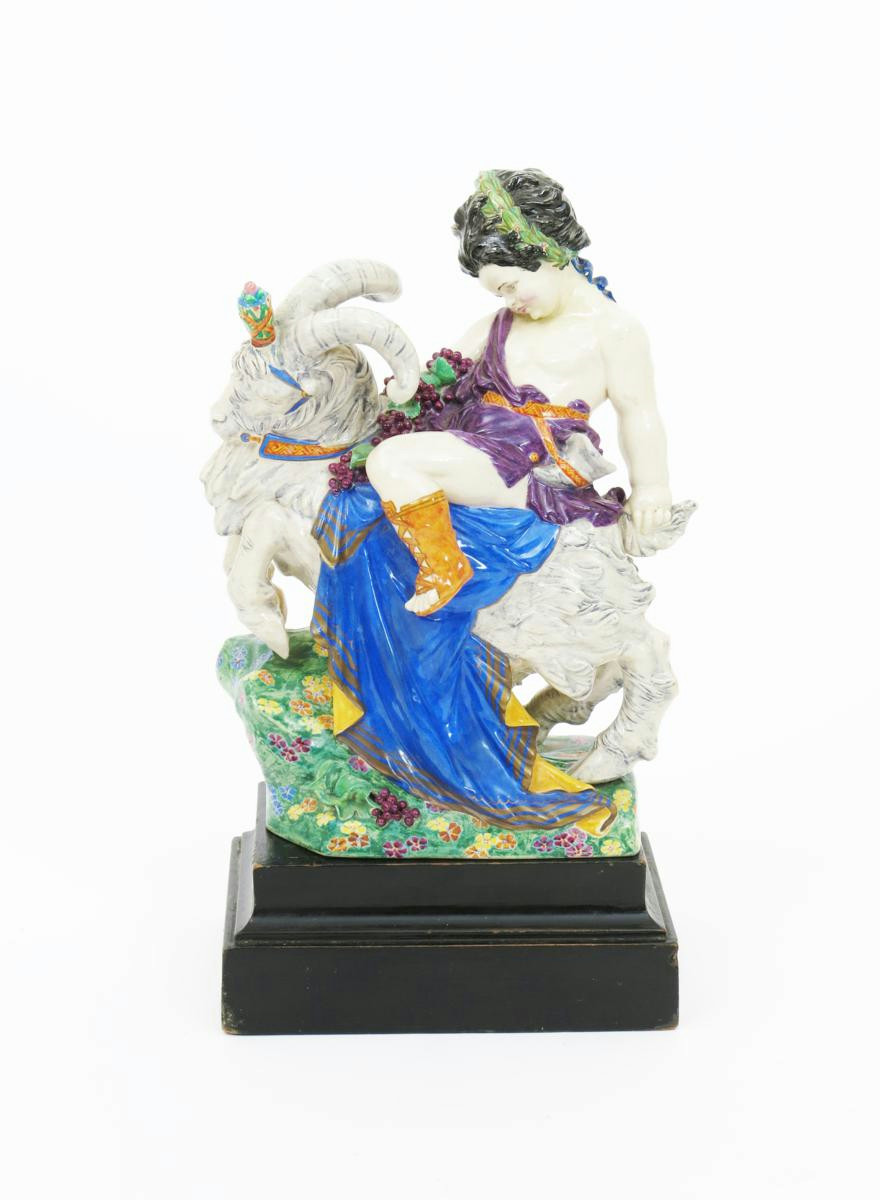 Boy on a Goat a Charles Vyse pottery figure, dated 1923, painted in colours, with ebonised wood stand, painted CV monogram and date, head restored 27cm. high