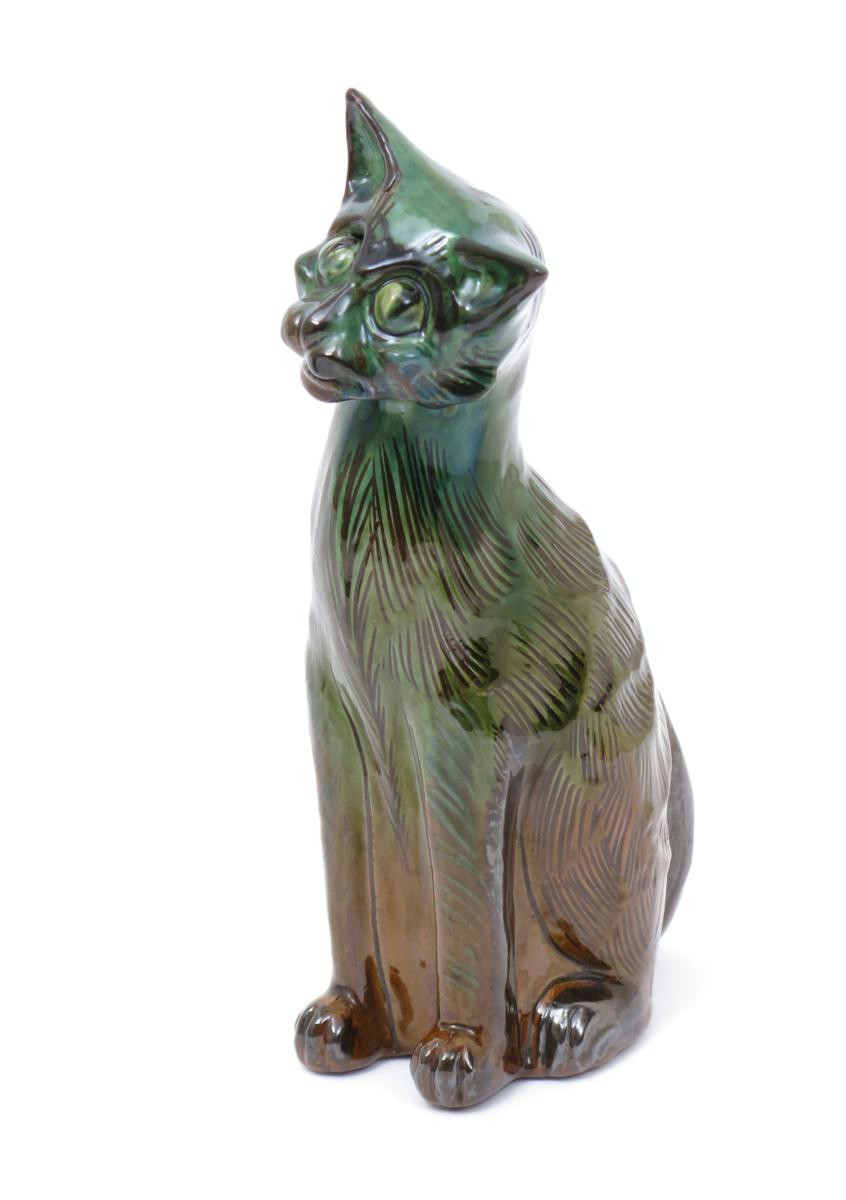 A C H Brannam pottery model of a cat, modelled seated with head slightly tilted, glazed green, yellow and brown, incised C H Brannam Barum, professional restoration to one ear 28cm. high