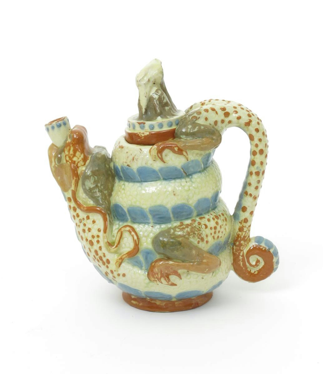 An unusual C H Brannam pottery grotesque teapot and cover, dated 1891, modelled as a dragon, the spout its upturned head, the handle its hind legs and scrolling tail, glazed in shades of blue, lemon and brown C H Brannam Barum 1891, professionally restored 21cm. high