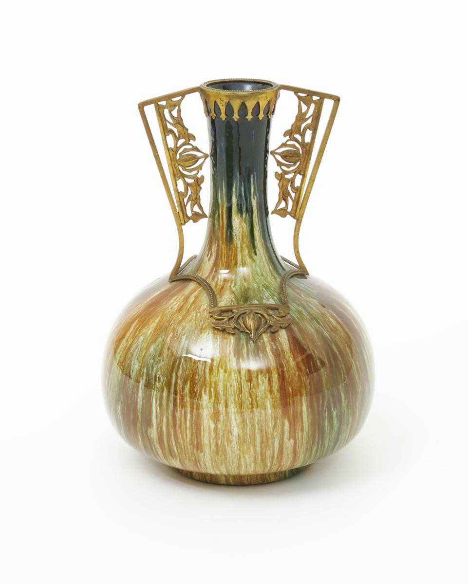 A gilt-metal mounted Bretby Pottery vase, ovoid with cylindrical neck mounted with gilt metal twin-handles and shoulder panels, covered in a streaked green and brown glaze 23cm. high