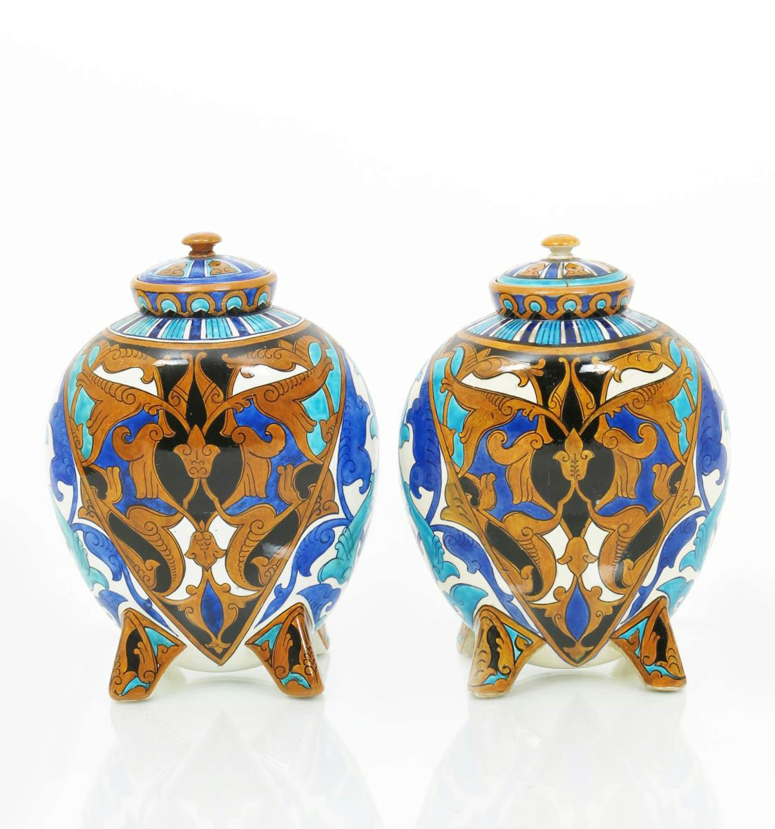 An interesting pair of Minton's Art Pottery Studio moonflasks with covers the design attributed to Dr Christopher Dresser, painted with scrolling foliage, in shades of blue, turquoise, black and brown on a white ground, impressed marks, painted Studio mark, covers repaired 31cm. high