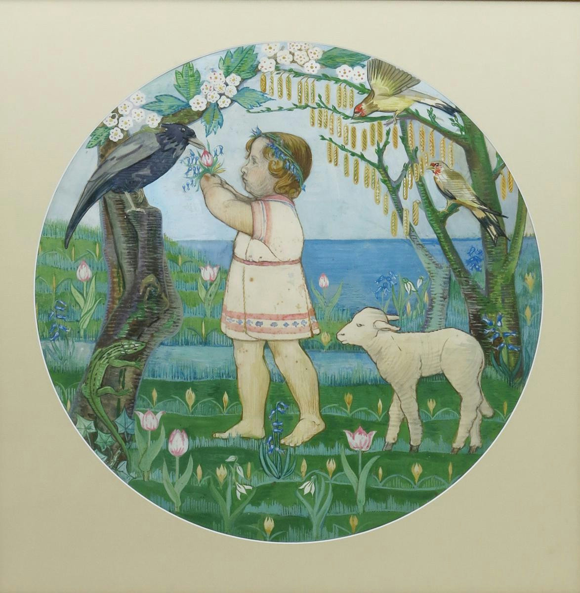 A watercolour on paper design, depicting a child offering up spring flowers to a crow perched on a tree trunk, a lizard, lamb and finches watch on, framed, unsigned, annotated in pencil E.M.Rope West Wing to reverse, image 51cm. diam.