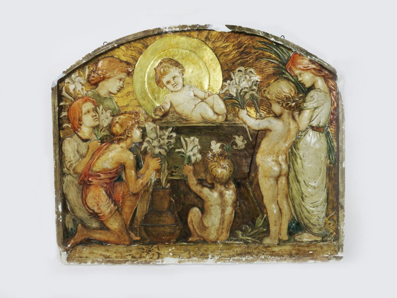 A large painted plaster plaque in the manner of the Compton Potter's Art Guild, decorated in low relief with the Adoration of the Magi, in colours, highlighted in gilt, unsigned, chips 82 x 68cm.
