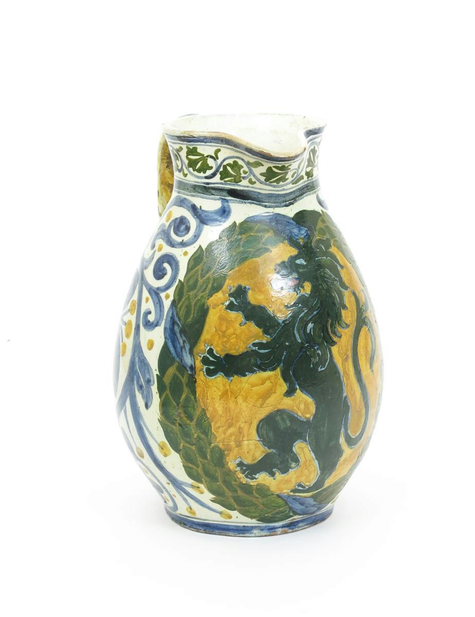 A large Della Robbia Pottery jug, dated 1895, swollen form with applied strap handle, painted with a lion rampant in green inside a laurel border, with blue scrolling foliage and yellow berries, on a cream ground painted DR mark dated 1895 30cm. high