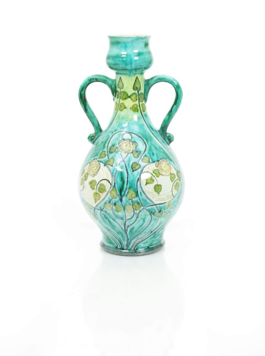 A Dellla Robbia Pottery Large Algerian vase by Tom Hall, ovoid with knopped neck and applied scroll handles, painted with Art Nouveau scrolling rose design, shades of pink, yellow and green on a turquoise ground incised mark, painted green monogram, professional restoration to handle and top rim, 40cm. high