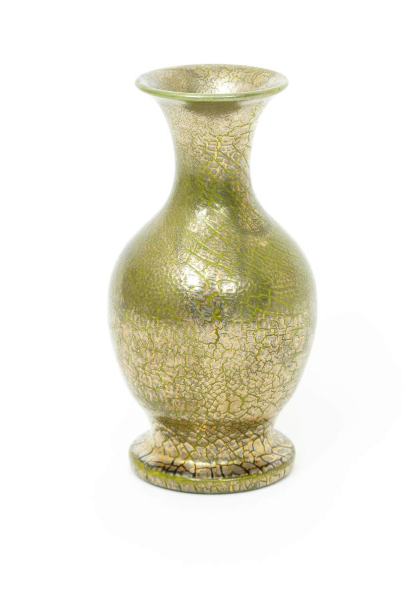 A Sunflower Pottery solifleur vase by Sir Edmund Elton, ovoid with flaring neck and foot, lime green covered in a crackled golden glaze, painted Elton to base 17cm. high