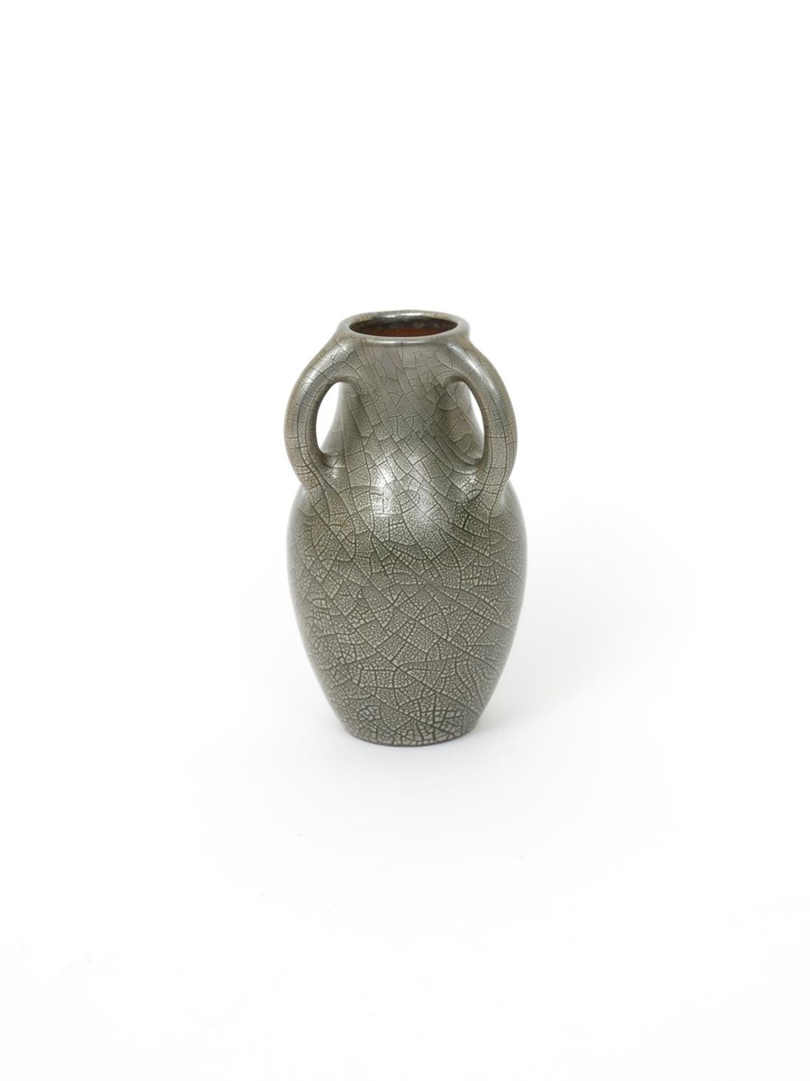 A rare Sunflower Pottery three-handled vase by Sir Edmund Elton, covered in a fine crackled golden glaze painted Elton to base under stilt marks, 18.5cm. high