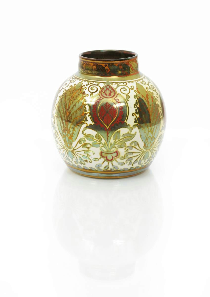 A Pilkington's Lancastrian vase by William S Mycock, dated 1920, ovoid with collar neck, painted with floral panels, in shades of ruby and golden lustre on a cream ground impressed mark, painted monogram and date 18.5cm. high